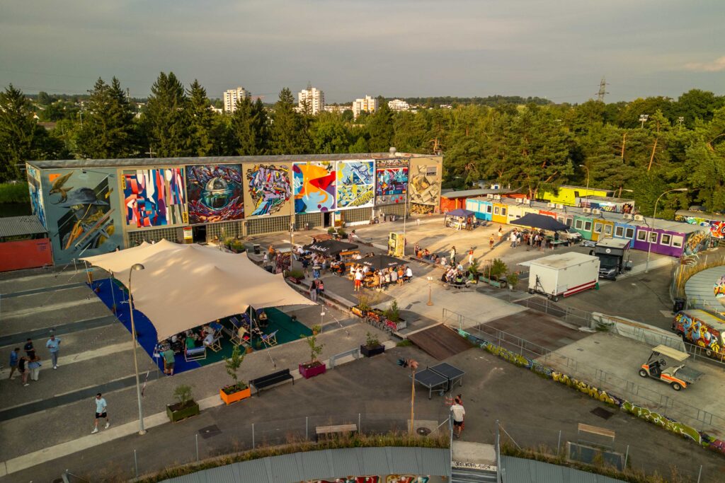 Das Graffland umfasst eine Eventhalle mit 500m2, eine Aussenfläche von ca. 2000m2, ein Café mit rund 40 überdachten Sitzplätzen und unseren eigenen echten Zugwaggon zum Mieten!